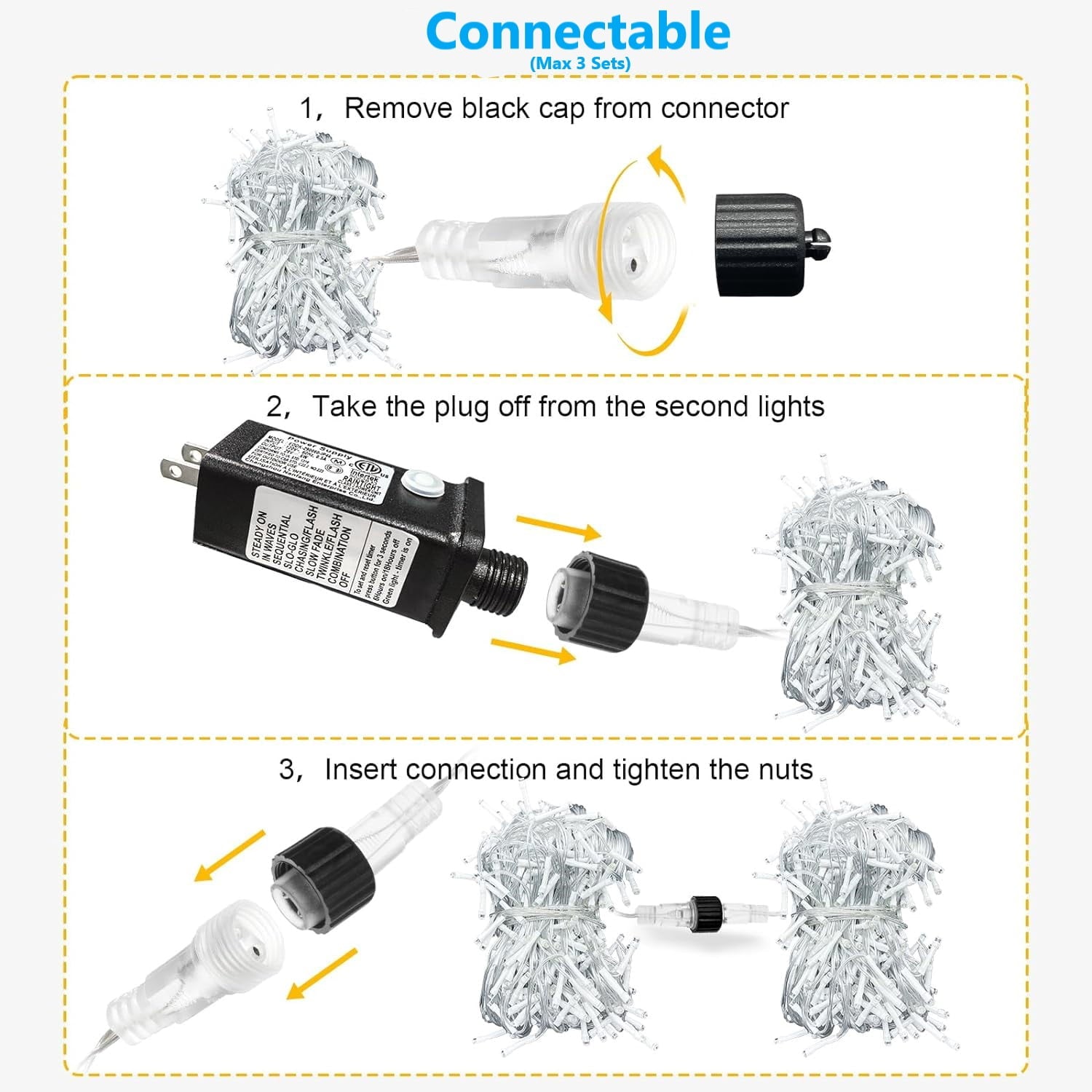 Connectable: The total length of this Christmas lights outdoor is 42.8ft, including 33ft icicle string lights with 400 LED bulbs, and 9.8ft lead cable. 9.84 ft of cord means no need to use extension cords, perfect icicle lights for outdoor decorations. And each icicle Christmas light has end-to-end connection that allows up to 3 light strings connected together to cover larger area and meet your different decorative needs. This icicle fairy light is the best choice to increase the festive atmosphere!