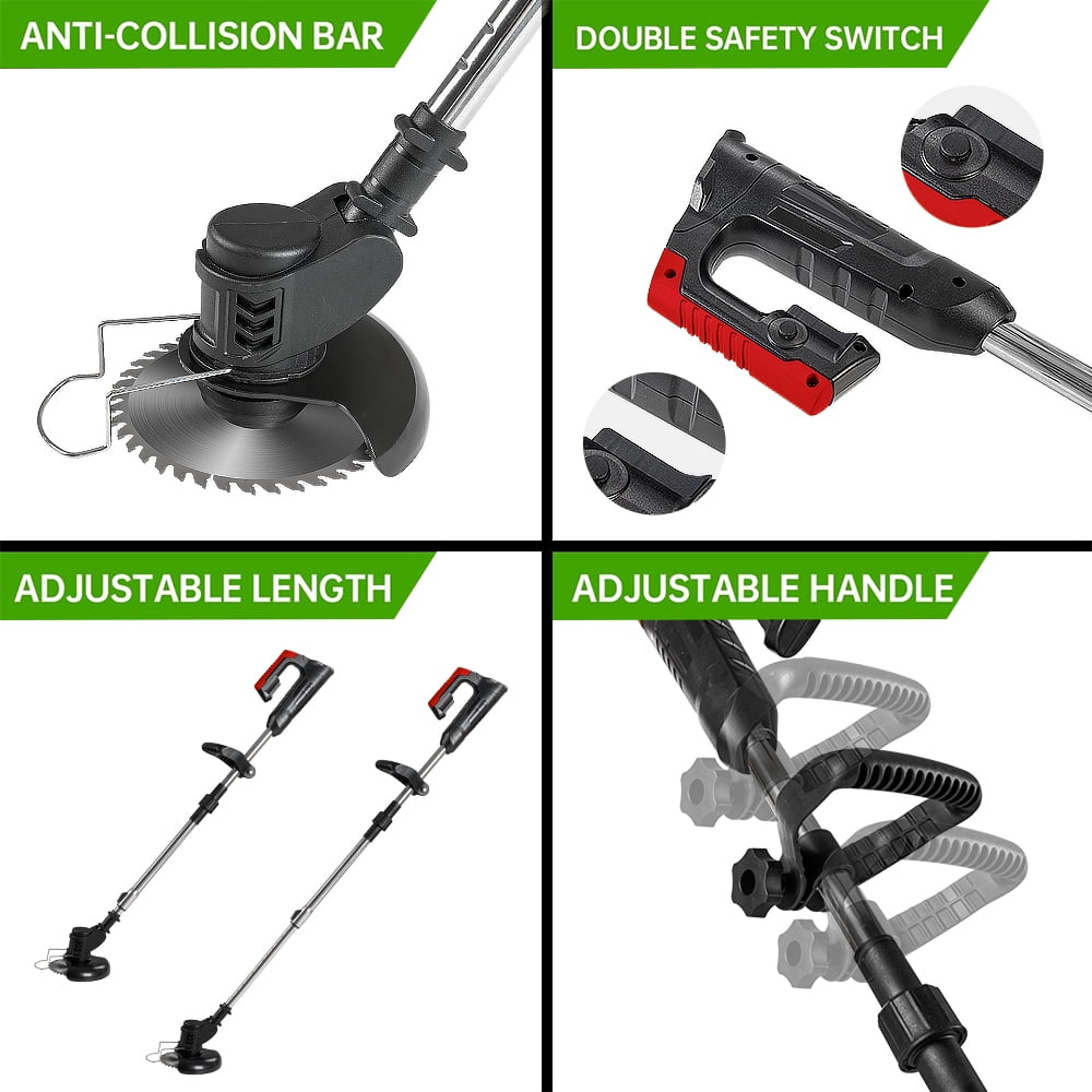Safety Design & More Reliable - Our power grass trimmer has passed the professional design and safety test. Double-switch safety lock function, which can effectively avoid the danger caused by accidental activation. The anti-collision metal pole won't damage flowers or ornamental plants while weeding while protecting the blade from hitting rocks or walls.